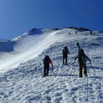 もとがゲレンデなんで危険個所といえる場所はリフトしたとか谷筋に下らなければほぼ皆無といってよいでしょう。それにしてもこの陽気で雪は腐りきってベチャベチャです。ちょっと斜度が上がるとシールも滑って(登高自体がへたくそという声もあり)、クトー持ってくればよかったと悪態つきながら最後はツボ足でゲレンデ上部まで登りあがりました。