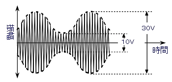 図は、単一正弦波で振幅変調した波形をオシロスコープで測定したものである。変調度の値で、正しいのは次のうちどれか。