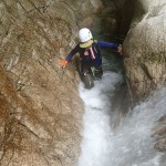 でも取り付から斜めに走るクラック沿いにいけば何とかなります。クラックに残置ハーケン2個、少し先に古びたリングボルトが1個あるので、ココは素直に使わせてもらいました。手持ちの20mロープでは少々足りず30m以上必要でした。ちなみに1個目の残置から落ち口までちょうど20mで後続の奥さんには途中までロープ無しで頑張ってもらいました(ドボンしても深いのでケガしないwというか楽しいぞ~)。
